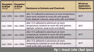 How warm is warm enough? So how warm does it have to be to avoid failure. It depends. Each vinyl is different, but the general rule is about 45°F (7° C). To be certain you’re within the optimal temperature range, consult the manufacturers’ published data. For ORACAL Vinyl, that’s easy to do because ORACAL publishes the essential specifications on the back of their color card. It’s a great resource. It shows a wealth of data for each product including seawater-ability, temperature resistance, adhesive power and, of course, minimum application temperatures. (Fig1) A quick scan of the ORACAL color chart shows us that the minimum surface temperatures for the most popular ORACAL vinyls are as follows: