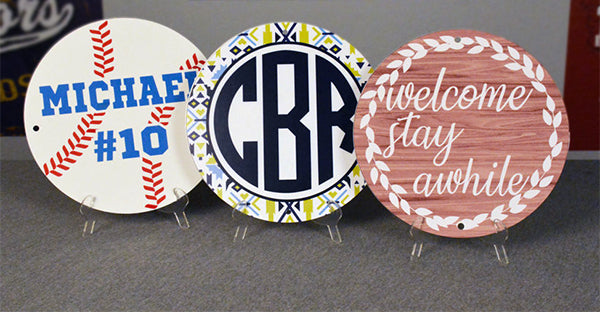 These kinds of sign blanks can be sold to all kinds of customers in brick and mortar shops and in online marketplaces. In addition to being versatile, our ten inch round sign blanks are surprisingly affordable. They're only $2.37 each with a minimum order quantity of five. Such a small price for so much creative potential! There are endless possibilities for these creative engaging sign blanks. From a welcome sign for your house to tell your guests they can stay awhile, to cheering on your children at their sporting events, round sign blanks can also make great gifts with monograms or personalized messages. A simple Etsy or Pinterest search can start your creativity flowing. Check out the gallery below and stock up on round sign blanks to add unique signs, gifts, and awards to your home, dugout, or storefront.