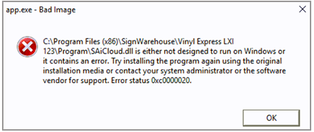 The good news: There's an army of white hat hackers working to stymie the black hat hackers. They're on your side. They work tirelessly to thwart the black hat hackers by closing backdoors that the bad guys want to exploit. When the white hat team finds and closes a door, they have to update their products so that their customers are protected. That's you. This is why you should always, always, always keep your software up to date. The best practice for software security to allow automatic updates. When your computer's OS and other applications are updated automatically, those backdoor vulnerabilities get closed and all is right with the world. What's all this got to do with LXi and FlexiSign software? Sometimes in old westerns, during fights between the white hat heroes and the black hat baddies, things got broken. Chairs got knocked over. And sometimes, in the digital brawls between white hat and black hat hackers, things get broken. Virtual chairs get knocked over. The automatic updates that protect your data can change your computer just enough to break the connection between your PC and your SAI software license. When certain chairs get knocked over, you'll the error message below (Fig 1). It tells you that your software isn't designed to run on Windows. This is, of course, nonsense.
