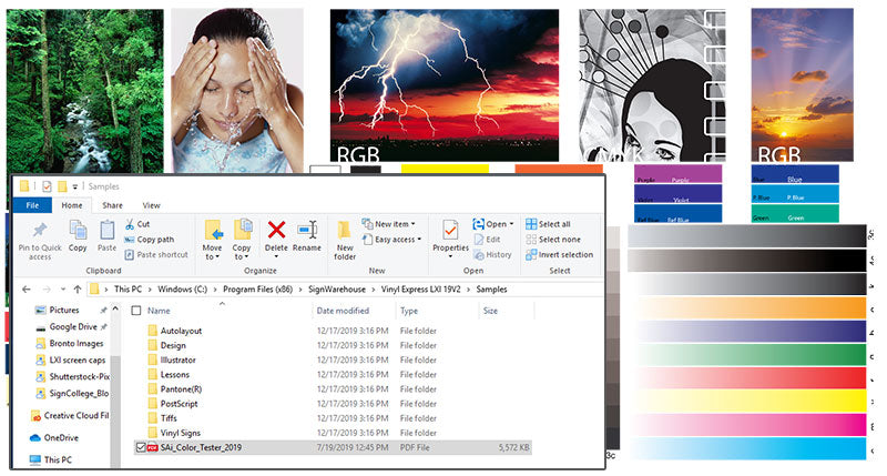 As a good all-purpose test print, we recommend the SAI Color Tester sample print (Fig 1) that comes pre-loaded with each LXI RIP 22Â or FlexiPRINT and Flexi Sign & PRINT license. Itâs good for color calibration but itâs also a good sample to use when you want to exercise your printerâs ink delivery system. The standard nozzle check uses too little ink and is valuable only for ensuring that all the nozzles are clear. For stimulating ink flow, the SAI Color Tester is a good choice because it pulls ink from all channels. There is a color palette test pattern in most PrismJET or MUTOH printers that many people use for this purpose but itâs not ideal because it uses mostly CMY, with the black ink used only for reference text. You can find it on your hard drive in the Sign Warehouse/Vinyl Express LXI/Samples or SAI/SAI Production Suite/Samples folder on your hard drive, or click here to download and save it.