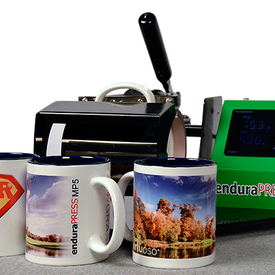 A sublimated 20z skinny tumbler sits in front of the Silverbolt MugPro5. ...