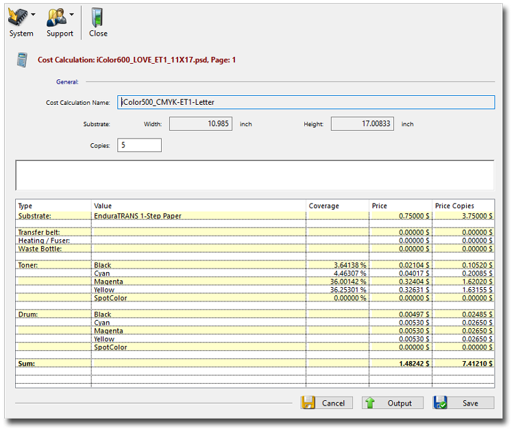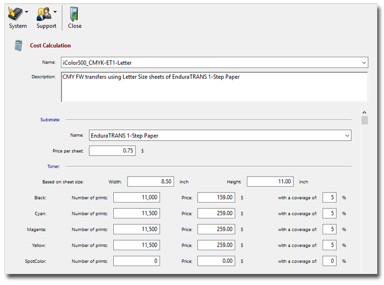 Paper & Toner: In the Substrate window, enter the type of paper. Below that, enter the price per sheet, then the sheet size. Since paper size affects cost, you should include the size of the paper in your description and create different configurations for different paper sizes. Then enter the toner and drum cost, yield, and coverage information using the guidelines from the User Manual referenced above, and your price for toner and drum cartridges. If you need a handy reference for toner and drum costs, you'll find them here. Click here to get transfer paper prices.