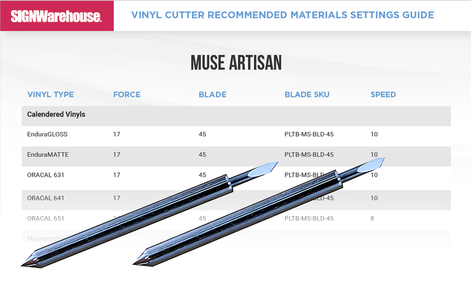The Vinyl Cutter Recommended Materials Settings Guide includes recommended speed, force, and blade settings for almost all of the vinyl cutters sold by SignWarehouse. You’ll find comprehensive guidance for Graphtec, Roland DG, Vinyl Express, and MUSE plotters, including legacy products like the Rogue Series and R31.